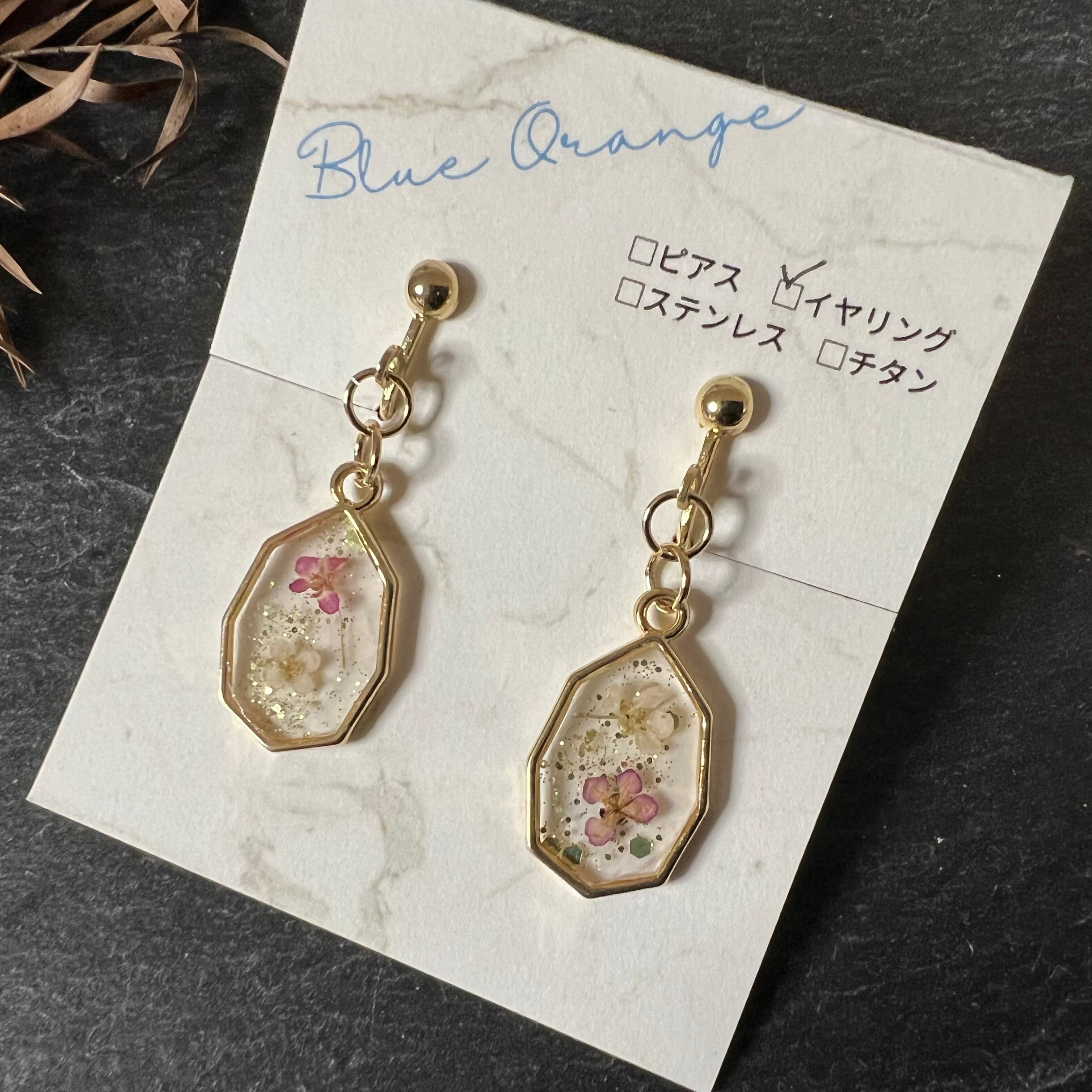 レジンに閉じ込めたお花が耳元で可憐に揺れ、注目を集める魅力的なイヤリングです。